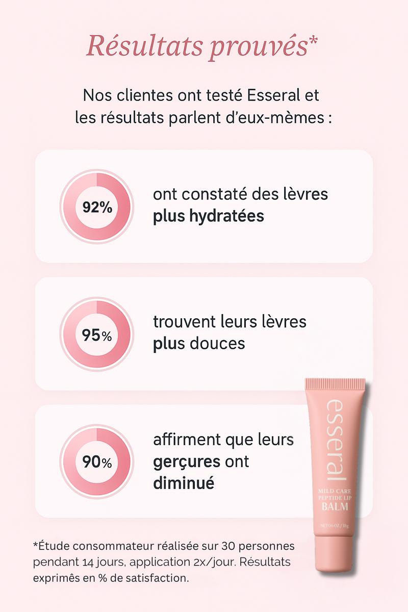 "Mes lèvres étaient abîmées et très sèches. Après avoir utilisé le baume Esseral, elles sont devenues plus douces, hydratées et confortables. Un vrai changement, mes lèvres paraissent repulpées et en meilleure santé !" Sophie L.