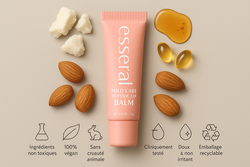 Notre baume à lèvres Esseral est formulé à partir d’ingrédients naturels soigneusement sélectionnés : beurre de karité, huile d’amande douce, miel et vitamine E.